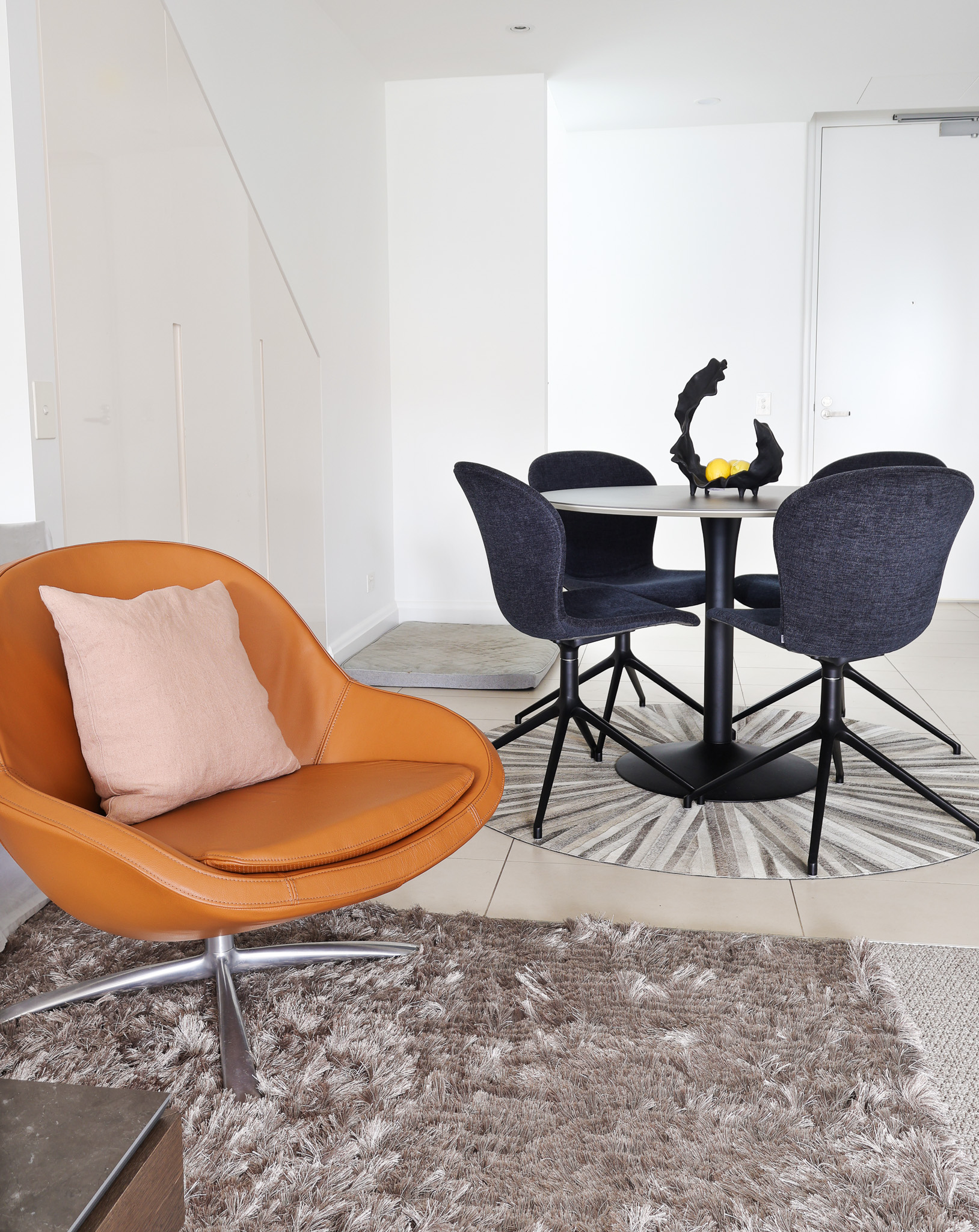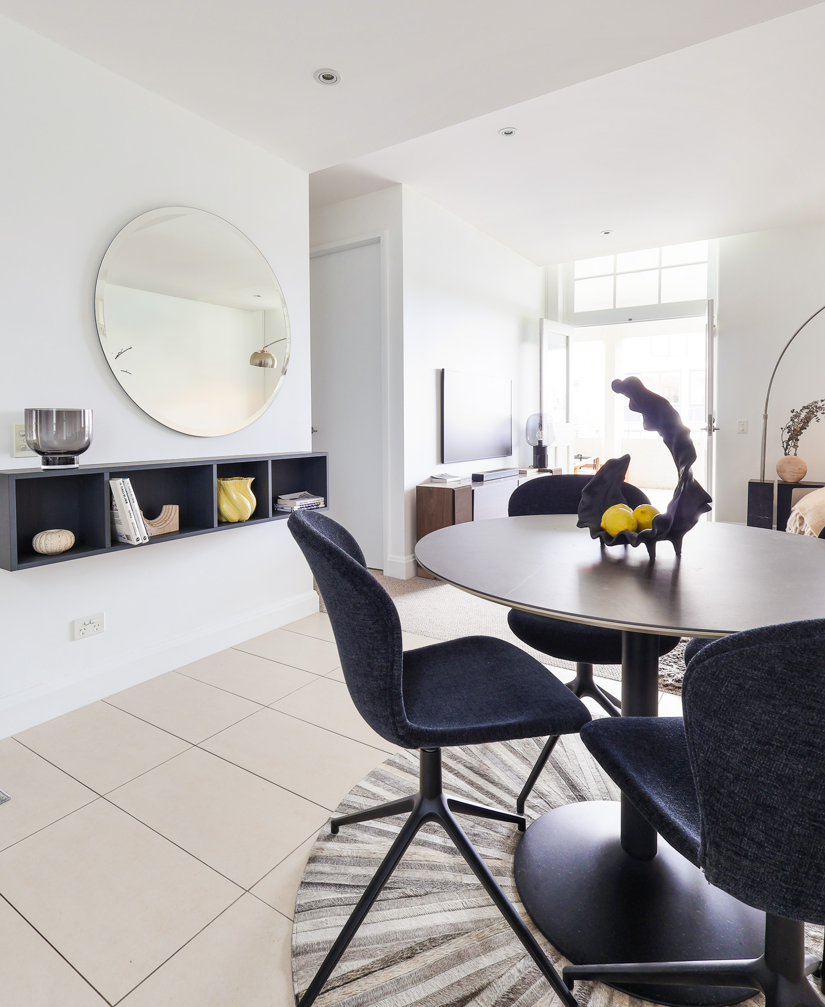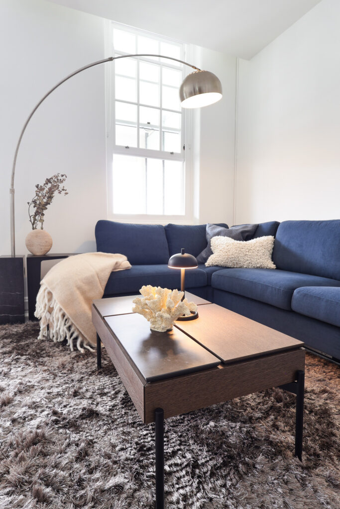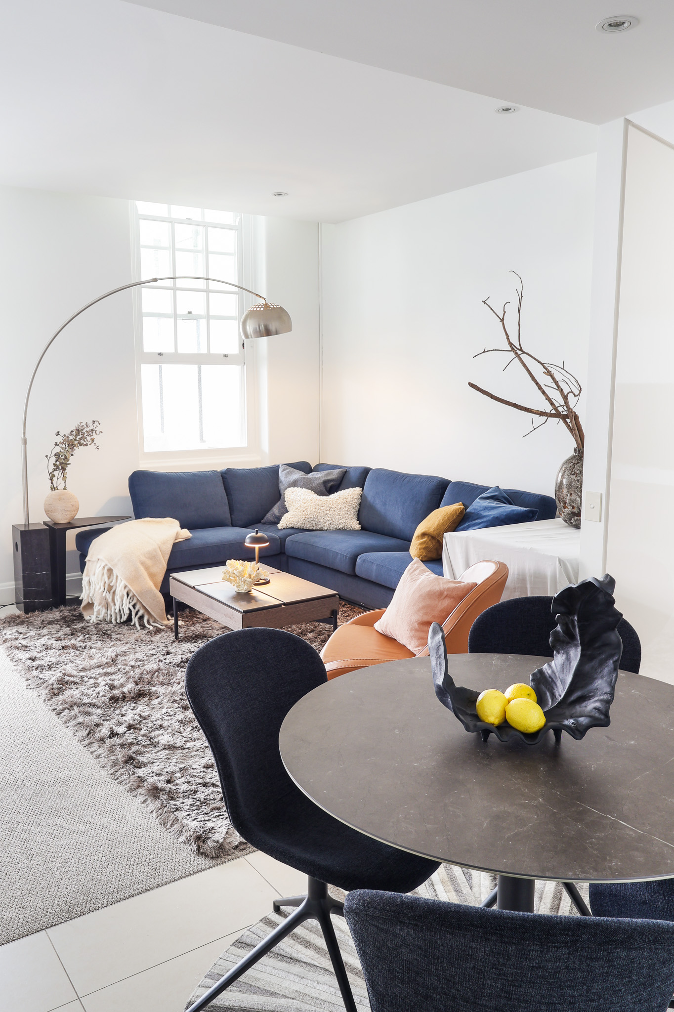 In the dining area, a round New York table was selected to improve movement and maximise space efficiency. Adelaide chairs in a matching blue tone connect the dining zone back to the living area, creating a cohesive visual link. The circular form also softens the overall layout and breaks up the linear structure of the room.