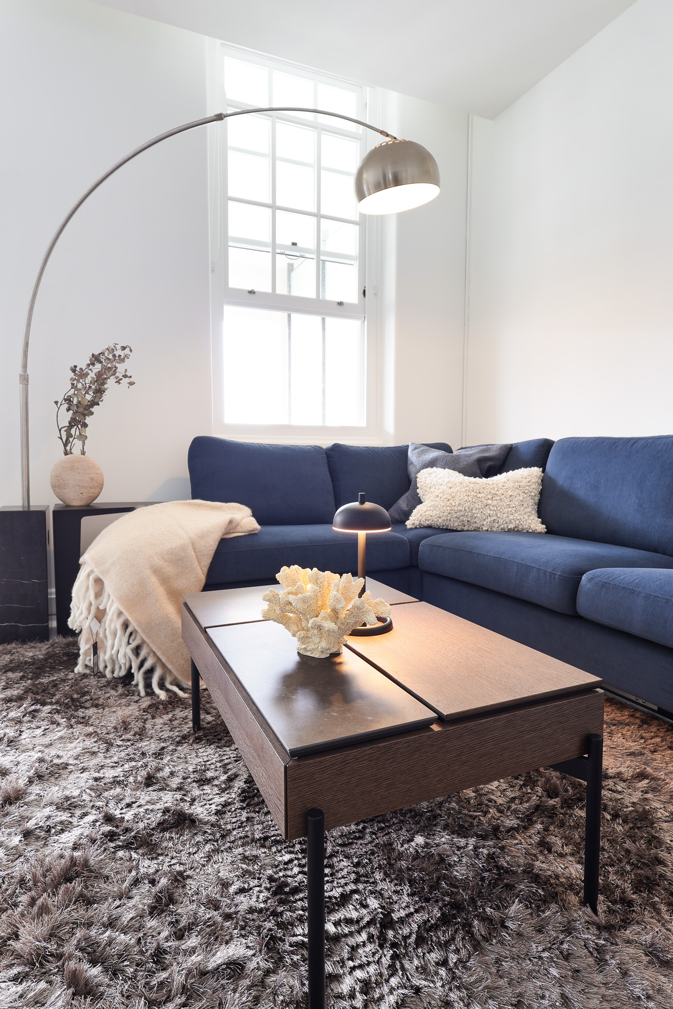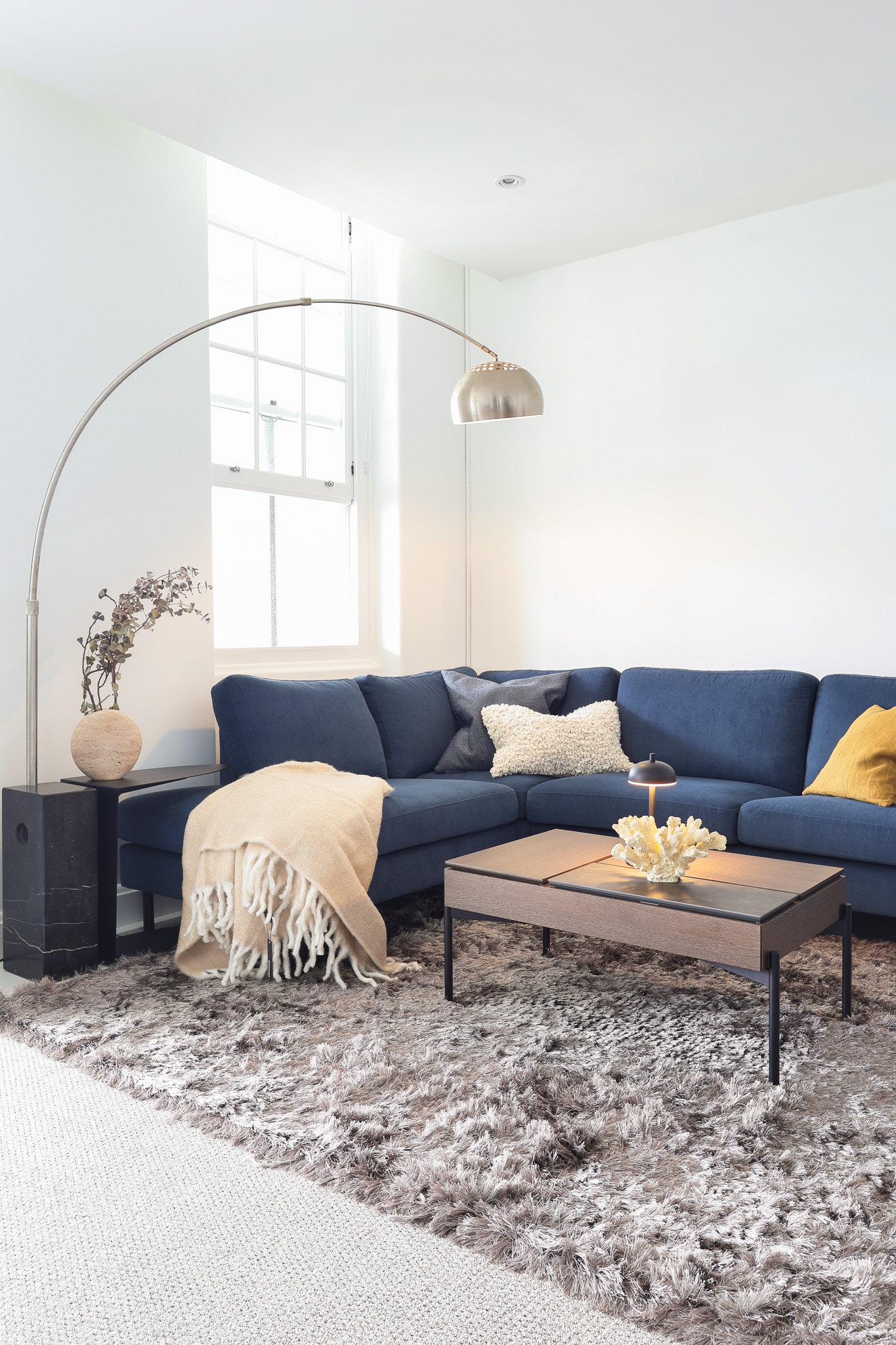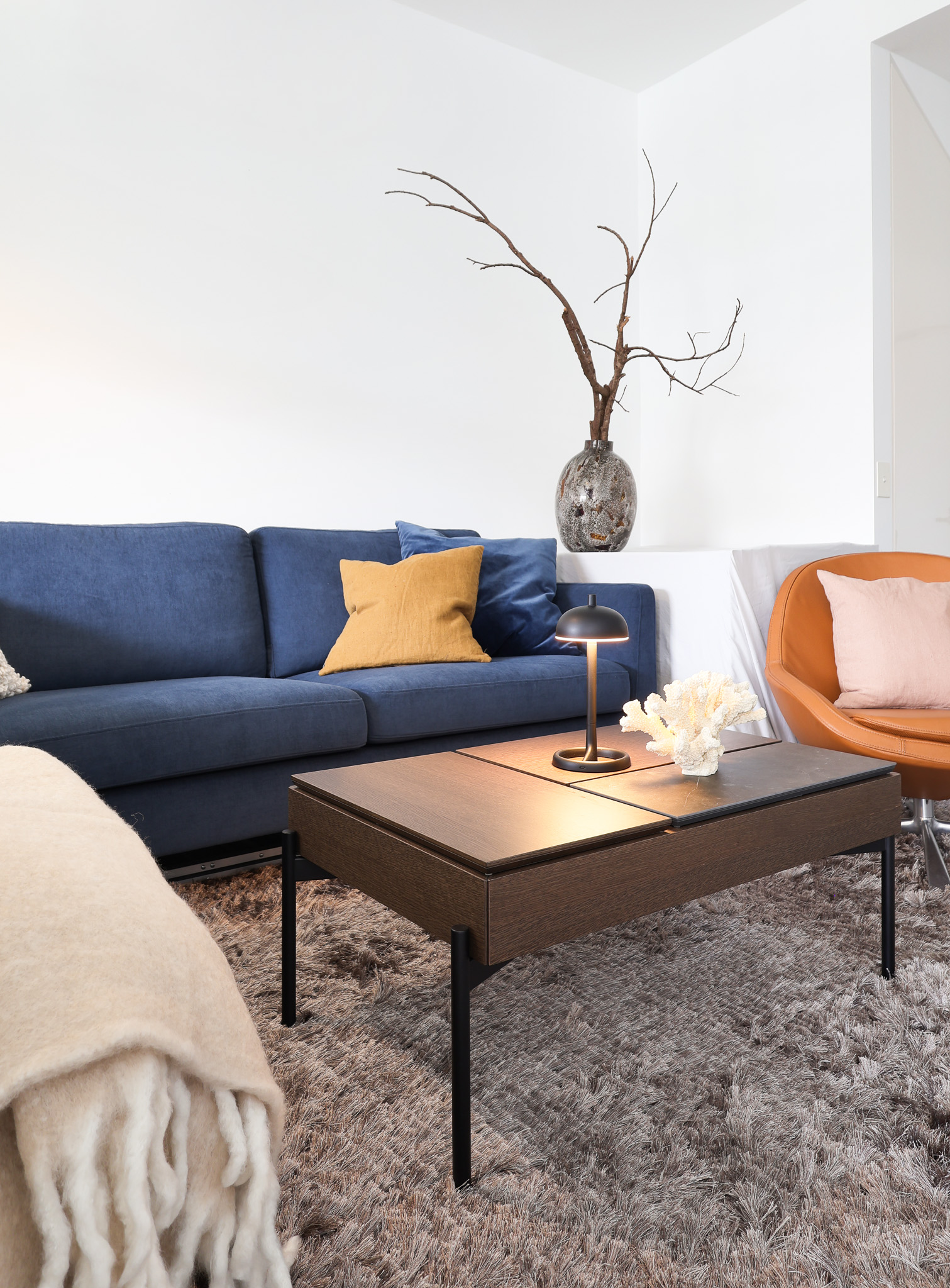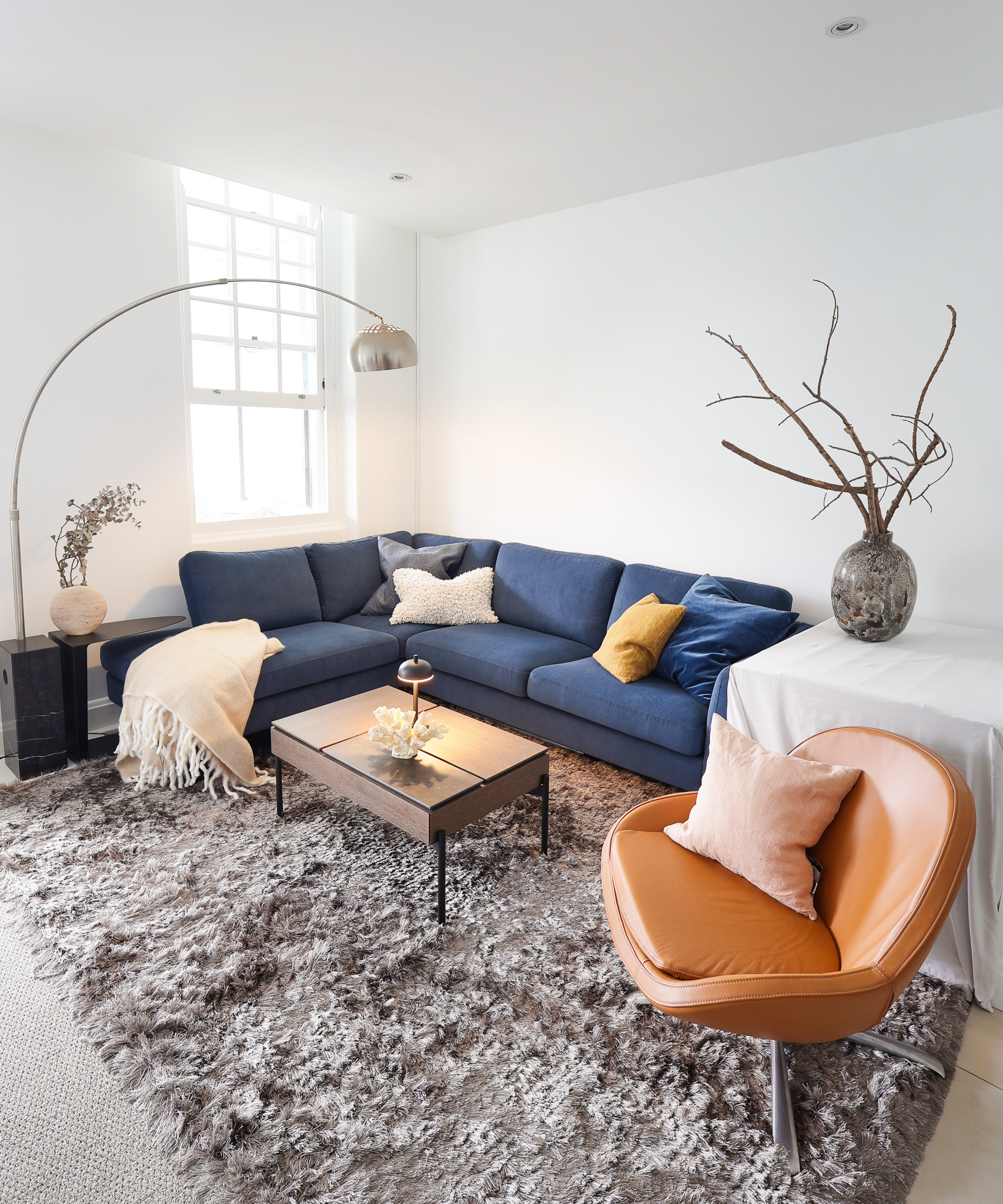 The living area is anchored by the Indivi sofa in a deep Frisco blue fabric, creating a strong visual centre. This is paired with a Veneto armchair in warm leather, adding contrast and a more tactile layer to the palette. A Chiva coffee table in dark oak grounds the space and ties into the timber finishes used throughout, while soft furnishings and subtle styling elements introduce additional texture without clutter.