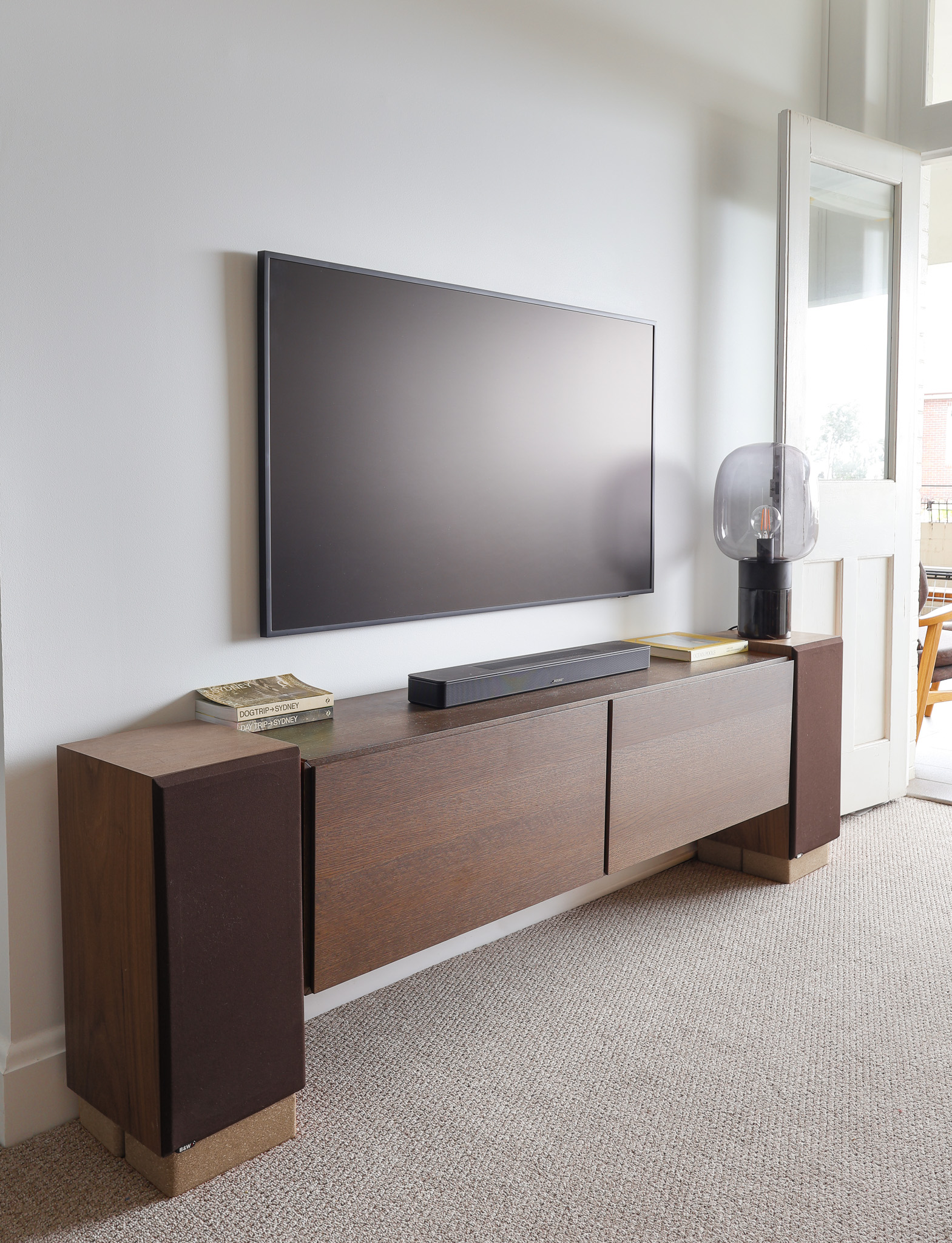 A wall-mounted Lugano TV unit in dark oak completes the space, keeping the floor area visually clear while reinforcing the material consistency established by the coffee table. Finishing touches, including sculptural decor and organic elements, add balance and softness to an otherwise minimal composition.